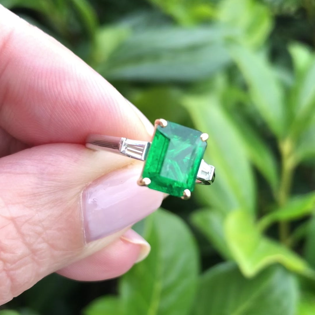 In this bespoke design, we framed this stunning hand selected emerald with rich 18ct gold and added two beautiful tapered baguette cut diamonds either side. The rest of this majestic ring is made using 18ct white gold, which brings added sparkle to those gorgeous diamonds.